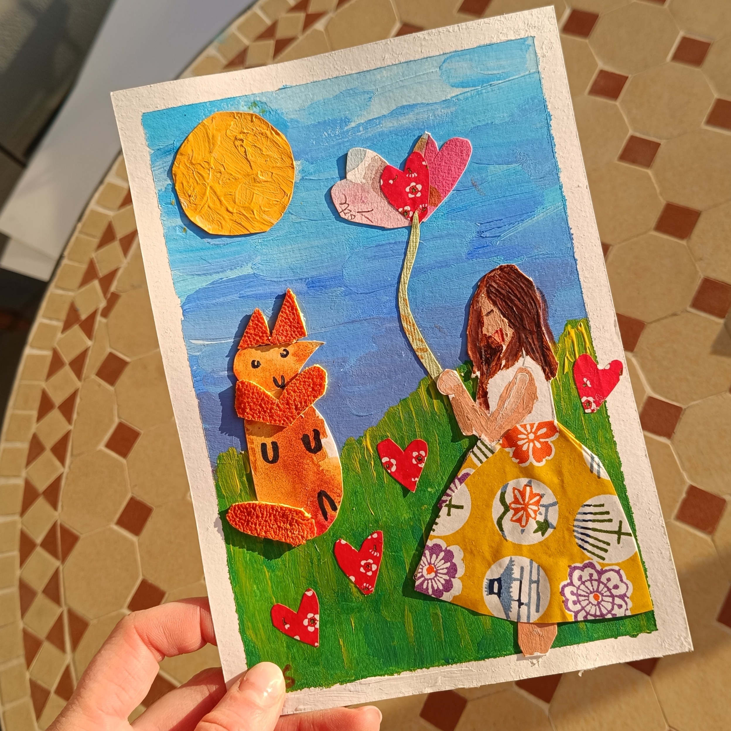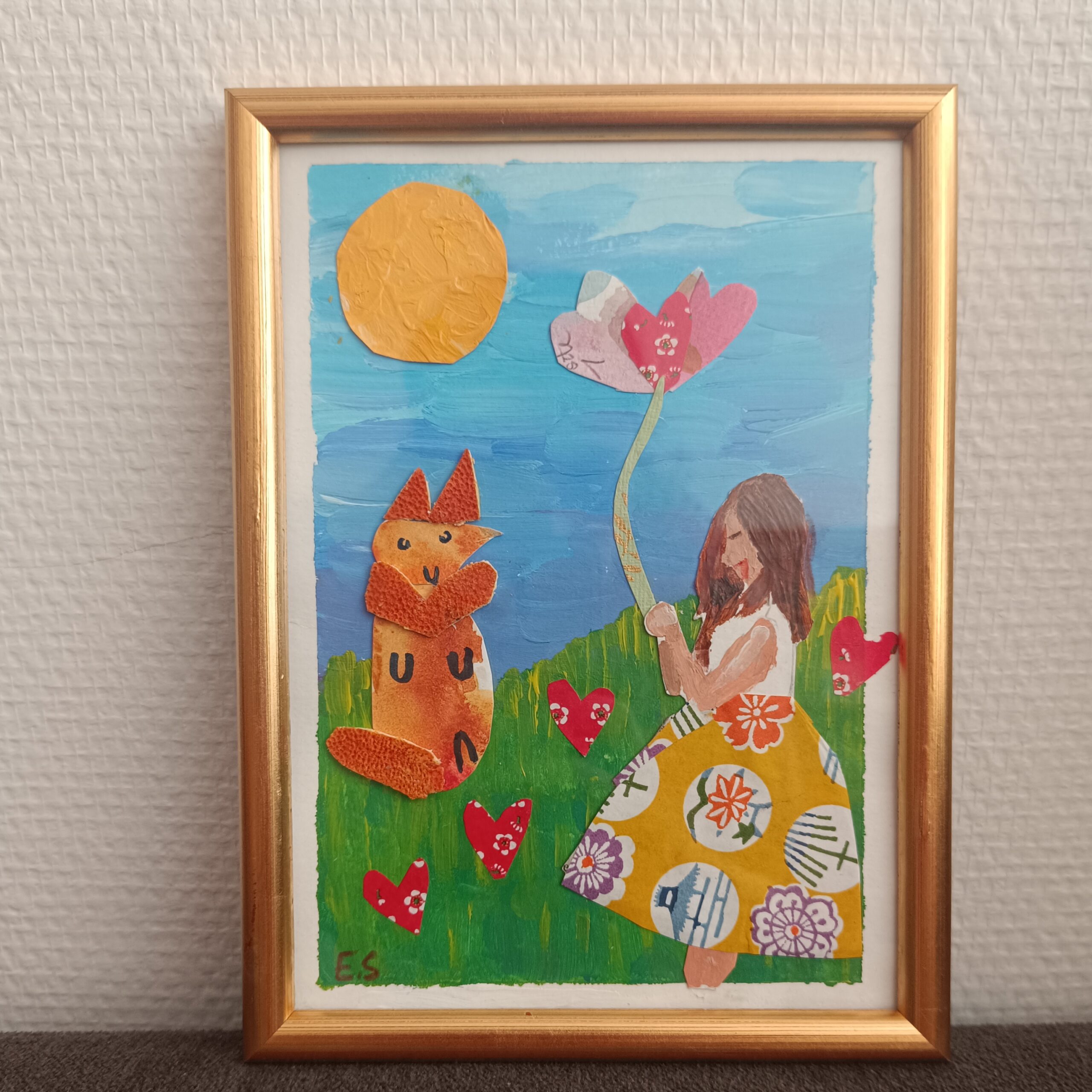 Collage original d’une jeune fille avec un renard, encadré. Le cadre est doré. Taille du cadre : 22x16cm.