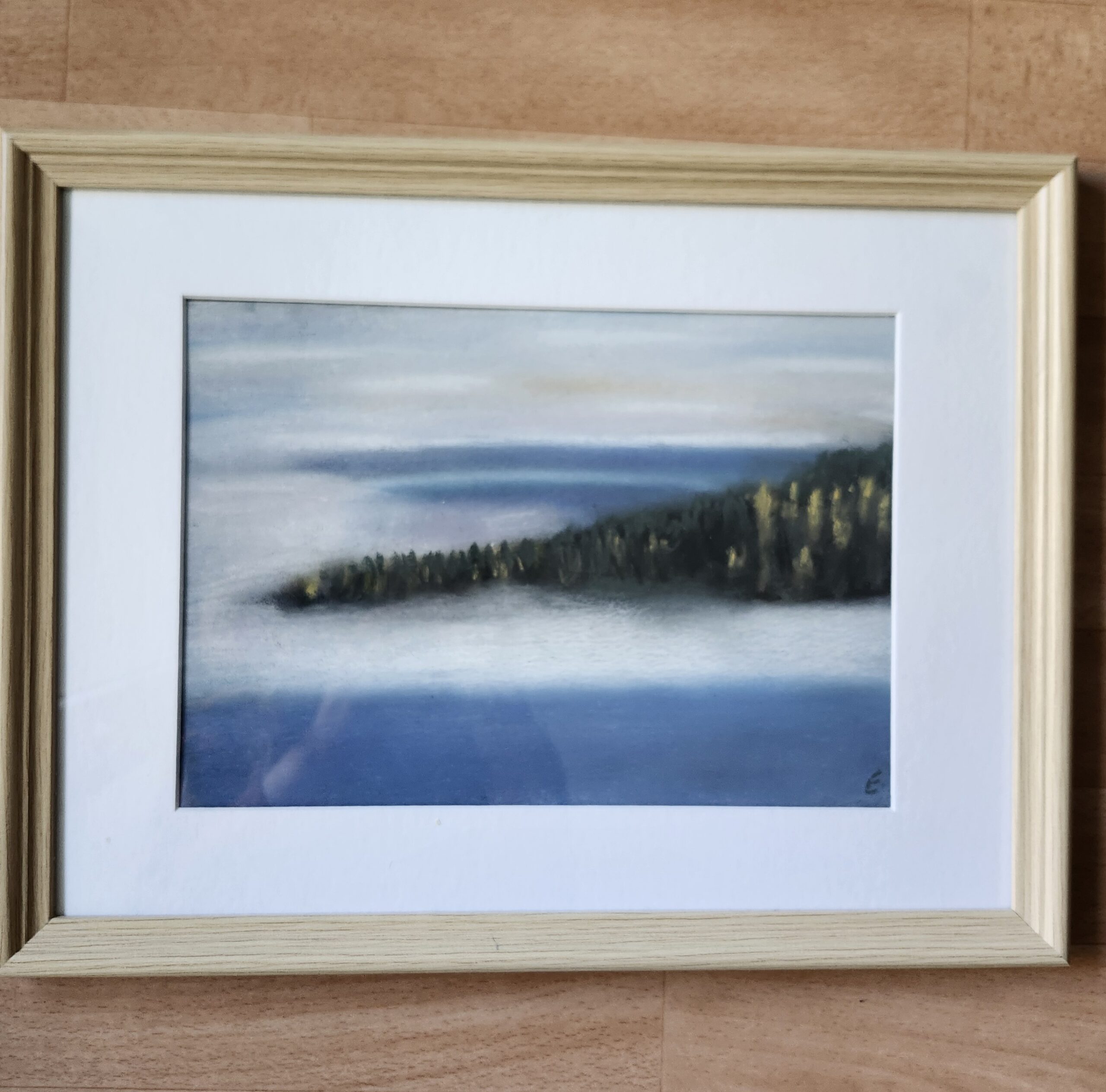 Paysage langue de terre dans les nuages au pastel sec. Original. Encadré 30x40cm